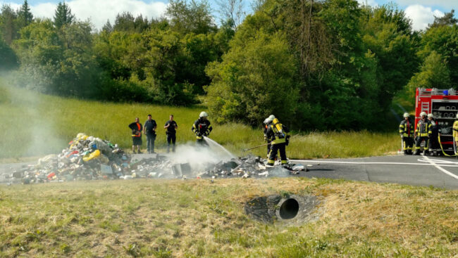Am Montagvormittag wurden wir nach Erlenbach zu einem gemeldeten PKW-Brand alarmiert. Bei unserer Ankunft stellte sich heraus, dass der Abfall eines Müllfahrzeugs brannte.
