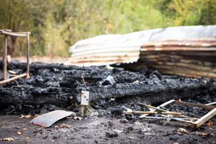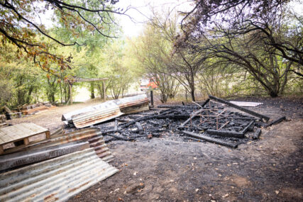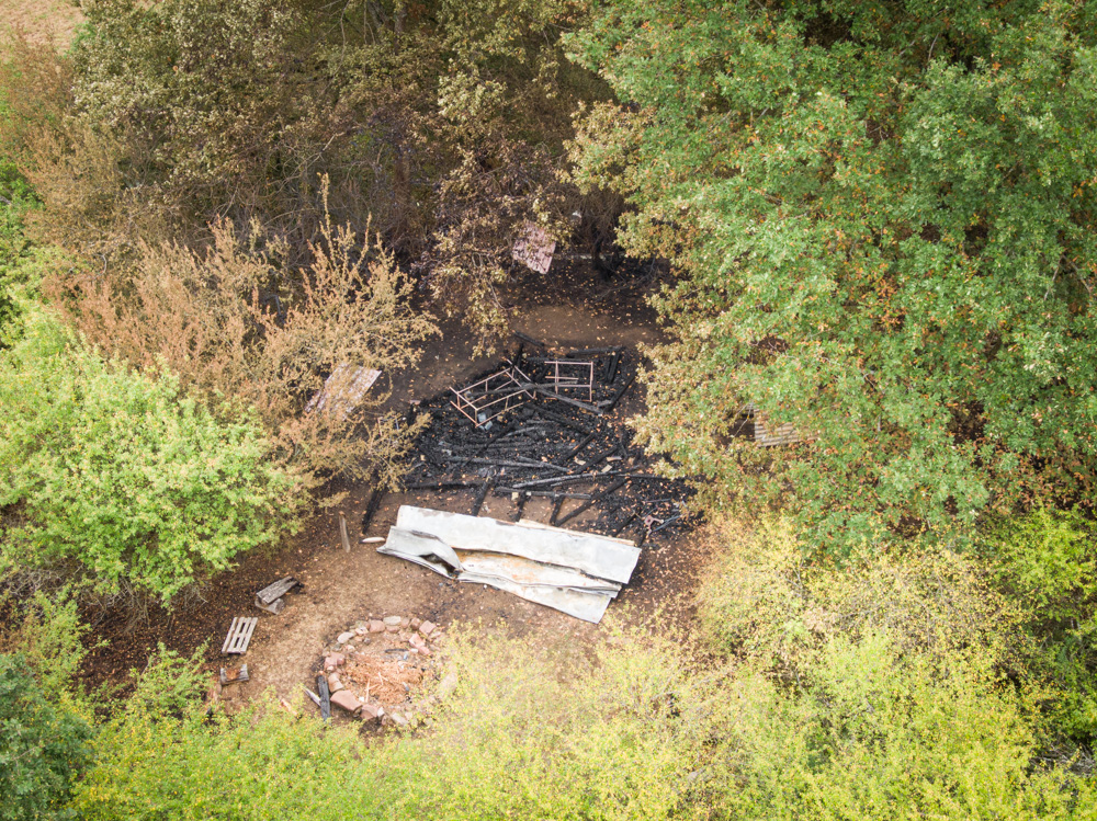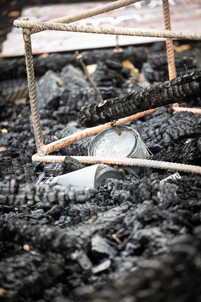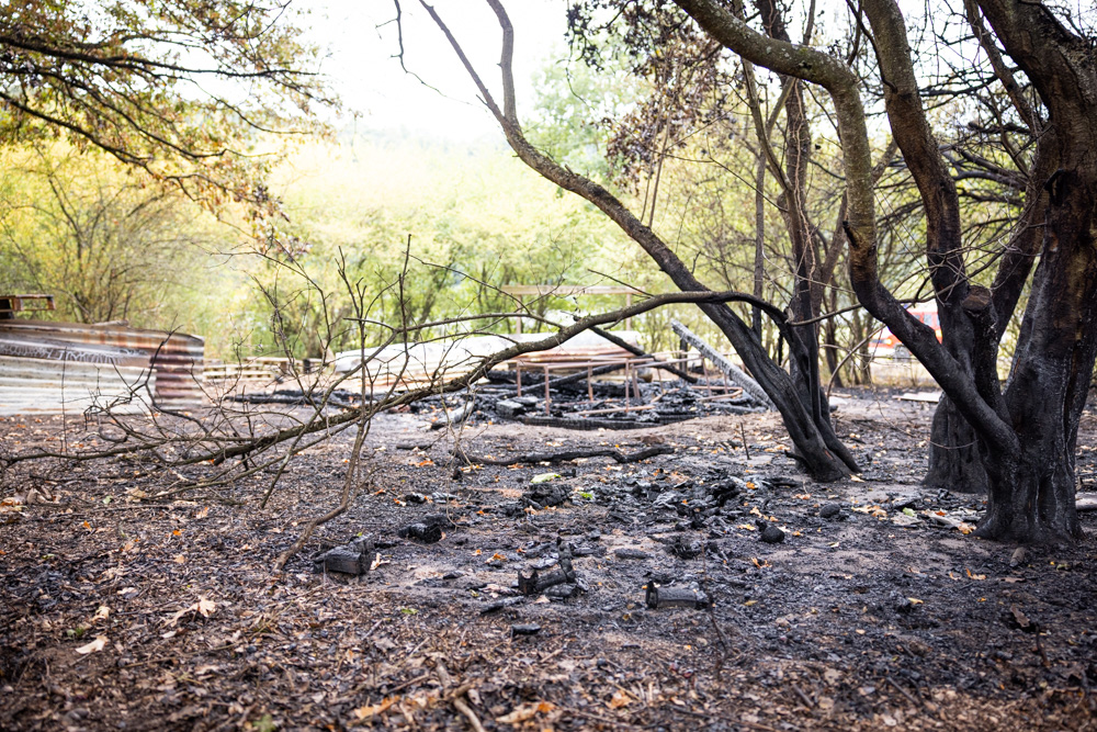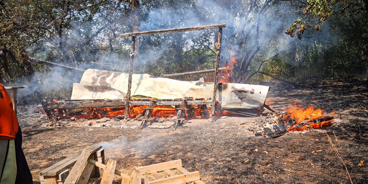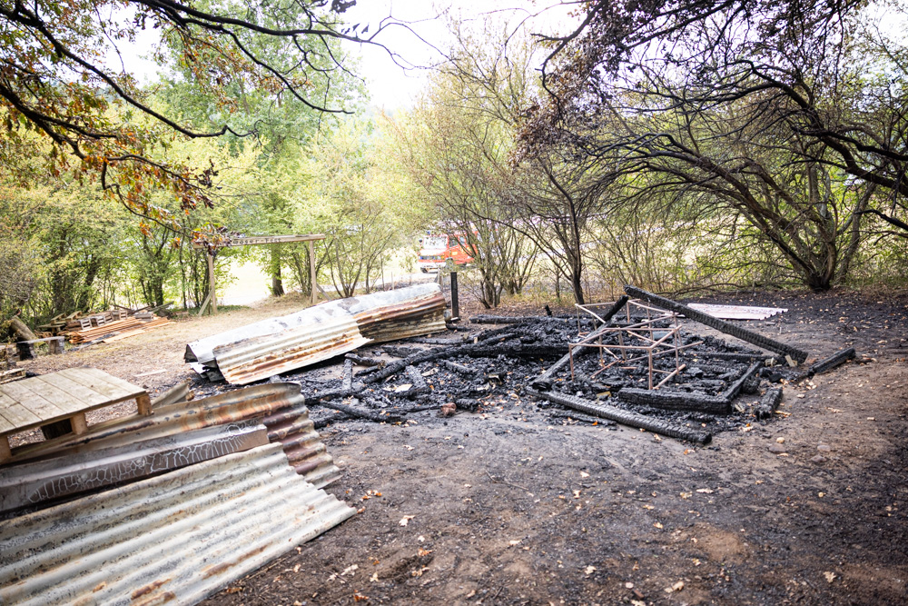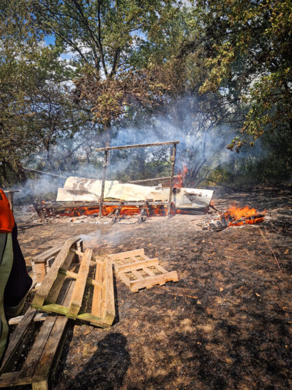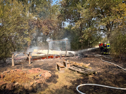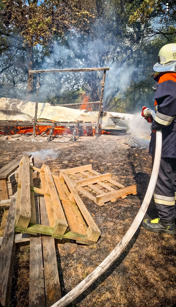 Als das Gebüsch und die Hütte größtenteils abgelöscht waren, zerlegten wir mit großer Unterstützung der anderen Feuerwehren die Überreste der Holzhütte.