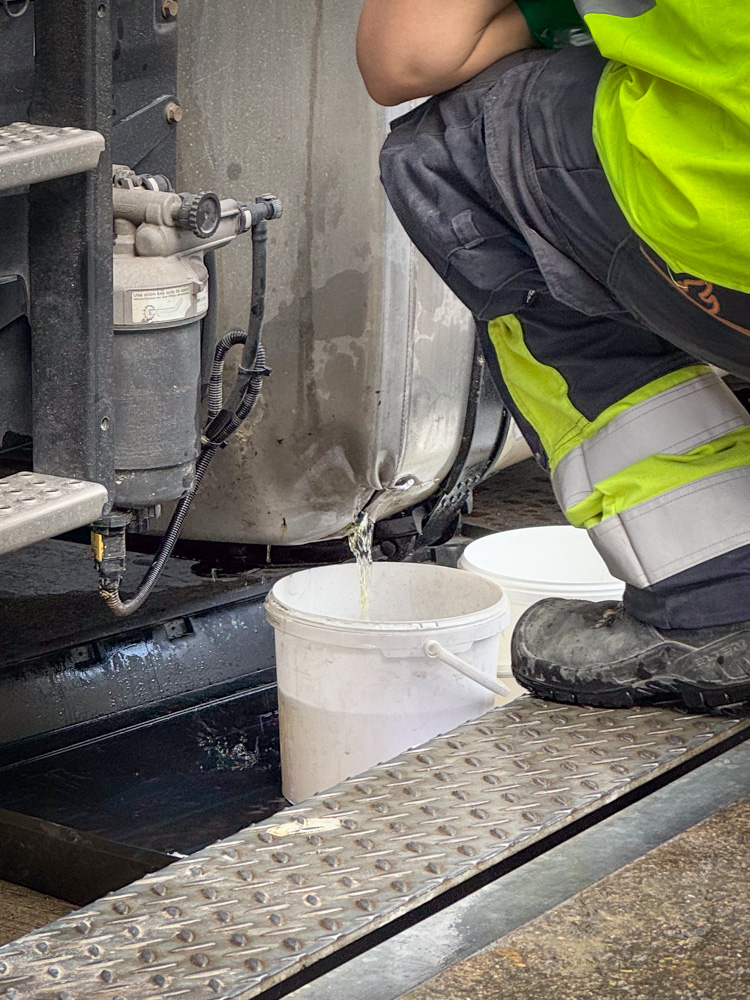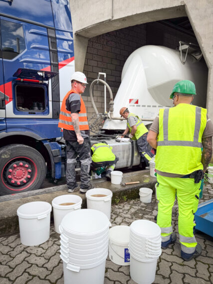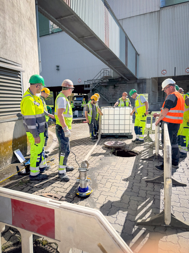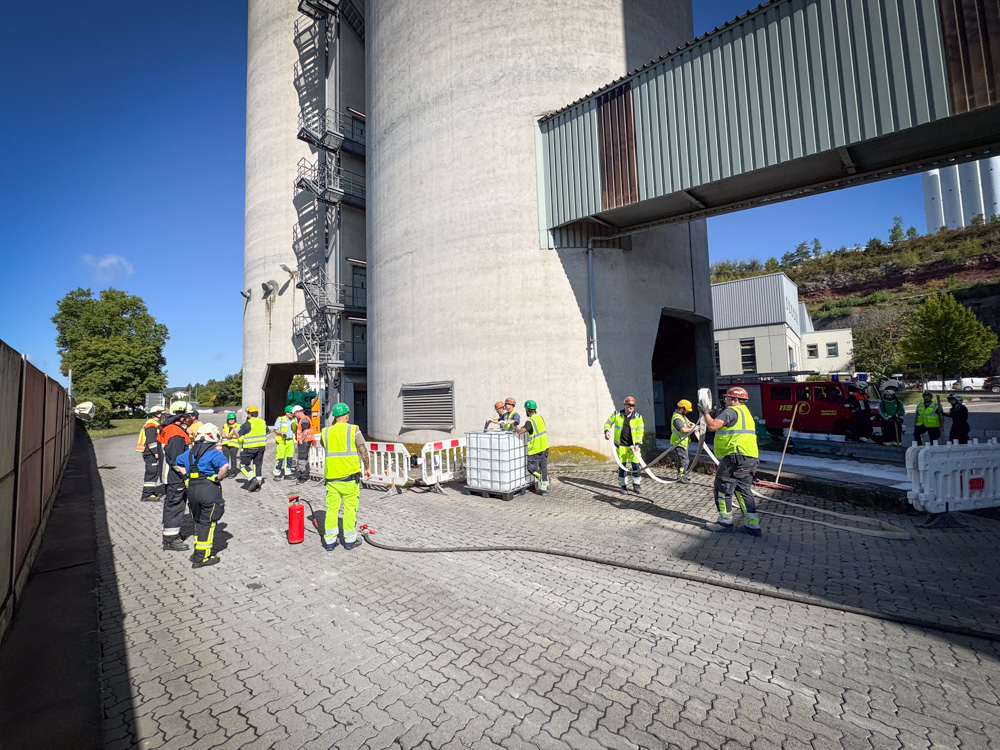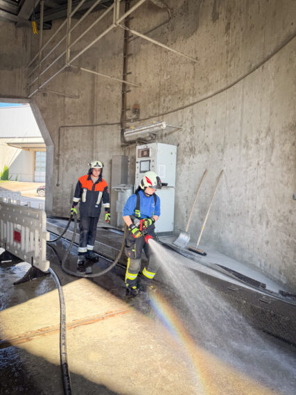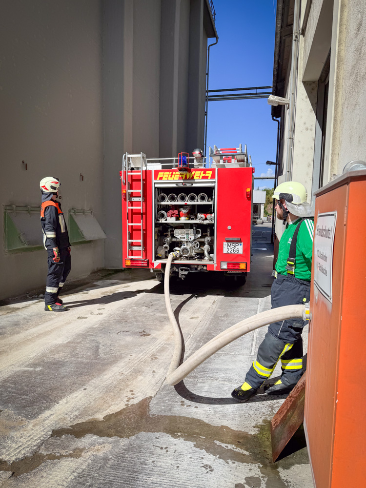 Beim Eintreffen stellte sich heraus, dass der Tank eines LKWs beschädigt war und Diesel-Kraftstoff ungehindert austreten konnte. Unsere erste Maßnahme bestand in der Sicherstellung des Brandschutzes, dieser wurde über die gesamte Einsatzdauer aufrecht erhalten. Die Mitarbeiter des Zementwerks hatten bereits eine Wanne und diverse Eimer unter die Leckage gestellt, um den Kraftstoff aufzufangen. Zudem wurde der Tank weitestgehend abgepumpt. Kurze Zeit später konnte der LKW von der Waage gefahren werden, wir begleiteten das Fahrzeug mit einer Wanne, da noch immer Diesel austrat. Anschließend konnten wir zusammen mit den Werksmitarbeitern auf der verunreinigten Fläche Ölbindemittel ausbringen, dieses wurde vom Zementwerk bereitgestellt. Nachdem die Gemeinde (Kläranlage,…) informiert war, wurde uns mitgeteilt, dass das Wasser nicht in das Abwassersystem gelangen kann. Demnach konnte das Wasser-Diesel-Gemisch aus zwei Schächten auf dem Zementwerksgelände in IBCs umgepumpt werden.