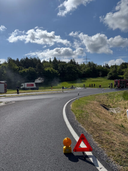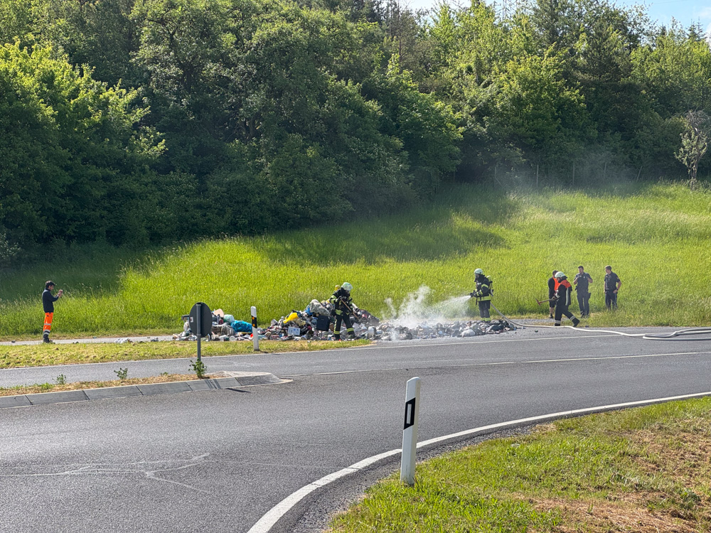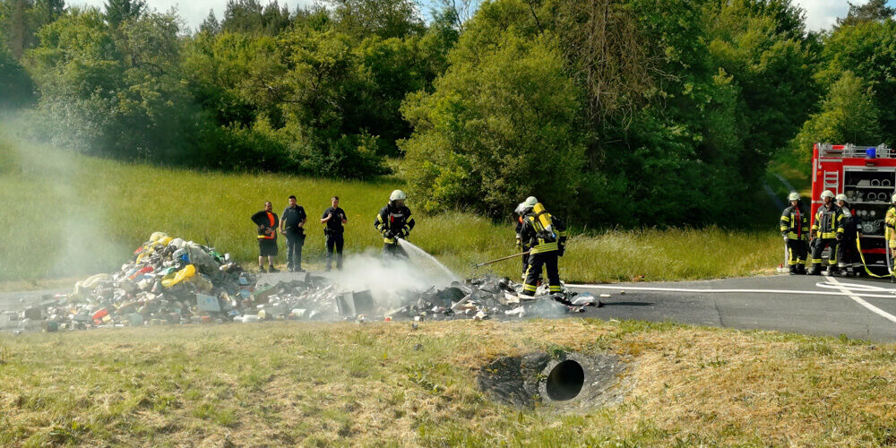 Am Montagvormittag wurden wir nach Erlenbach zu einem gemeldeten PKW-Brand alarmiert. Bei unserer Ankunft stellte sich heraus, dass der Abfall eines Müllfahrzeugs brannte. Der Fahrer hatte den Müll-Tank rechtzeitig auf einem geschotterten Weg entleeren können, um eine Brandausbreitung zu verhindern. Die Feuerwehr Erlenbach löschte den Müllhaufen, während wir zusammen mit der Feuerwehr Tiefenthal die Verkehrsabsicherung übernahmen. Wir konnten zeitnah abrücken und waren um 10:20 Uhr wieder einsatzbereit auf Wache.